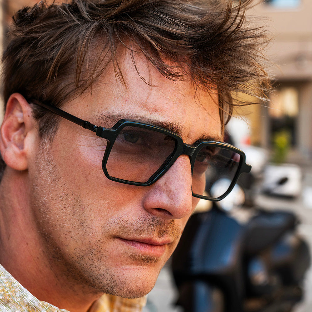 Bottechia features large lenses, and temples made from upcycled bicycle brake cables. The opening angle is fully adjustable and the total length can be shortened by 25mm. Includes case made with bicycle tire.
