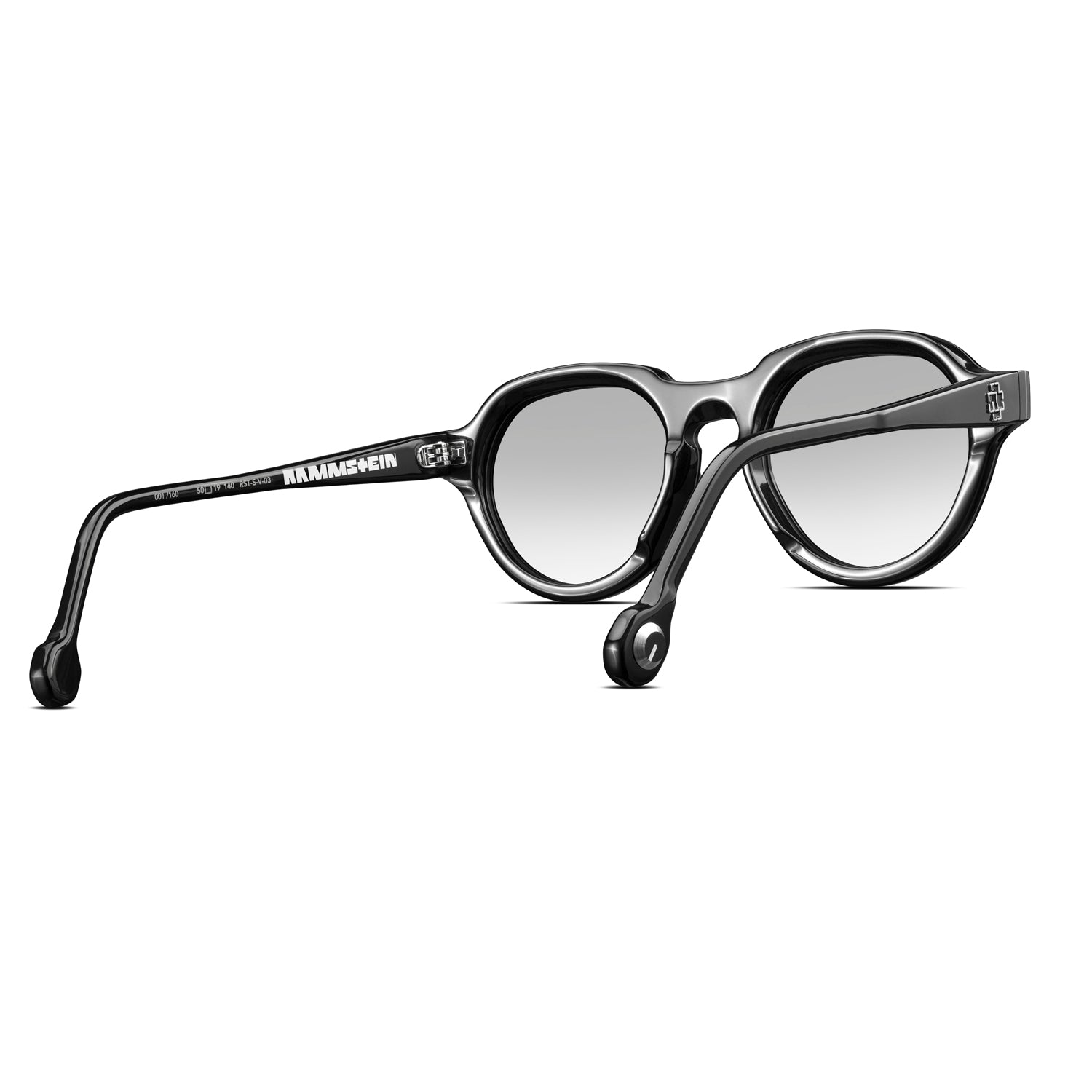 Each temple is serial numbered (up to 160) and features a vinyl frame front, an inlayed metal Rammstein "R" logos outside and an aluminum volume knob on the temple tip.