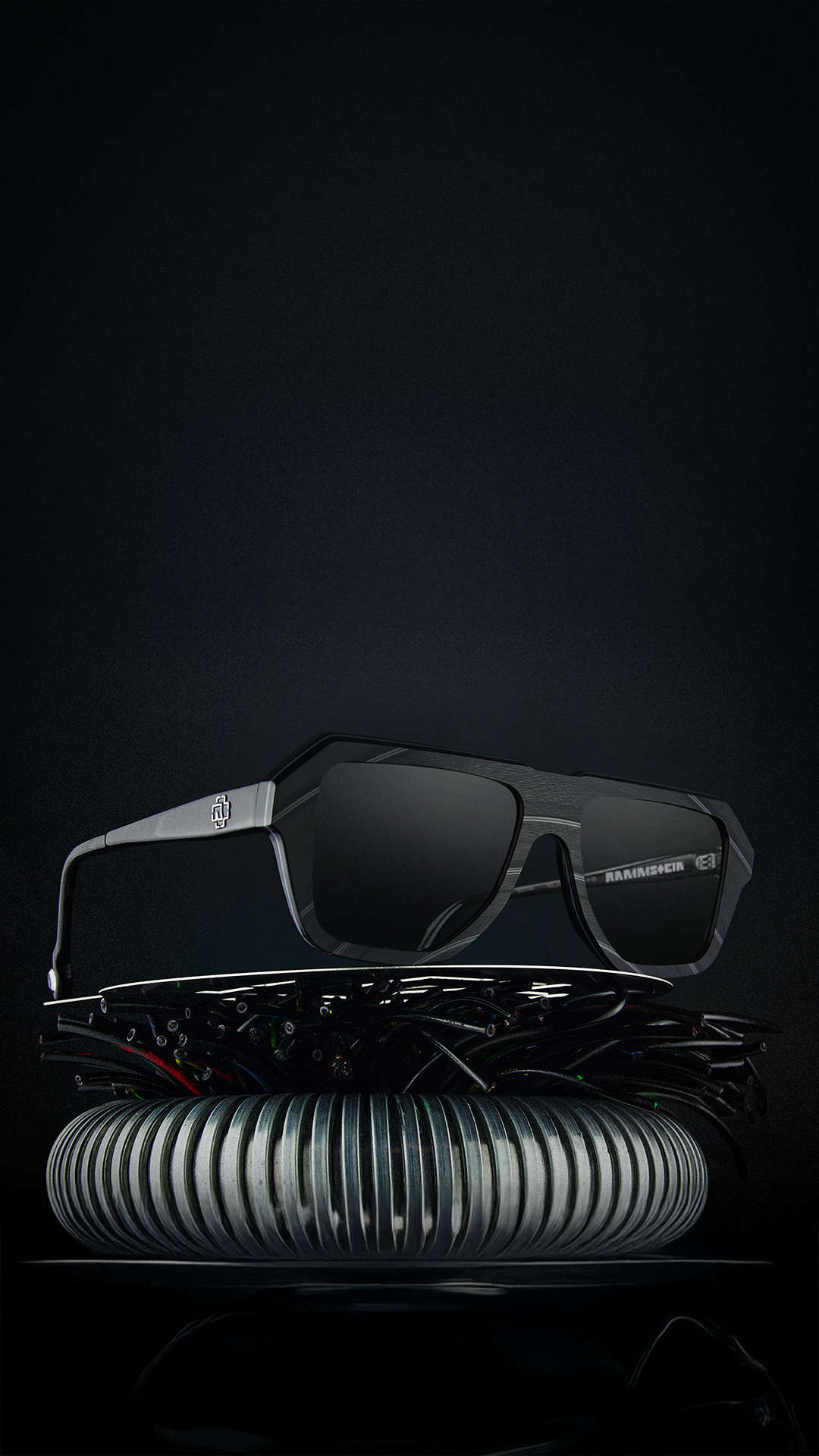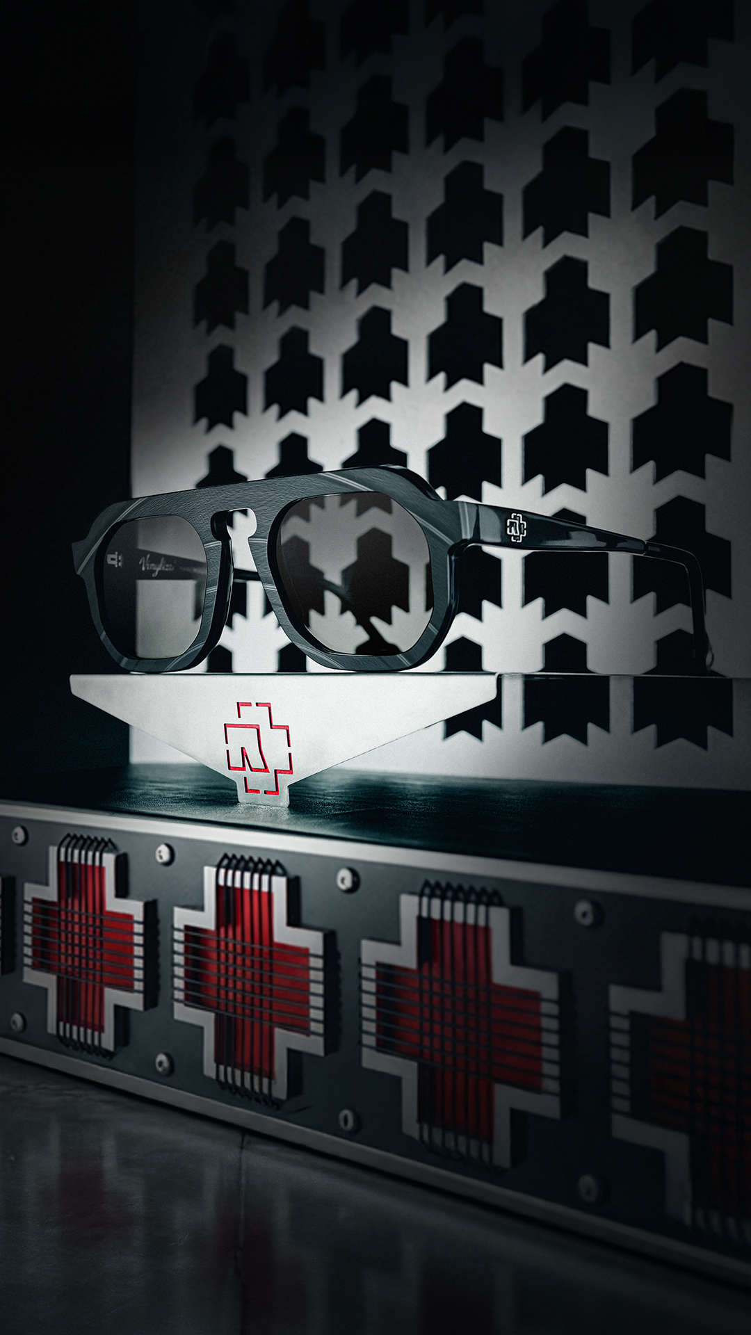 The frames reflect the same stark visual language that defines RAMMSTEIN: reduced, angular, purposeful – yet loaded with meaning. Black, grey, steel, engineered clarity.