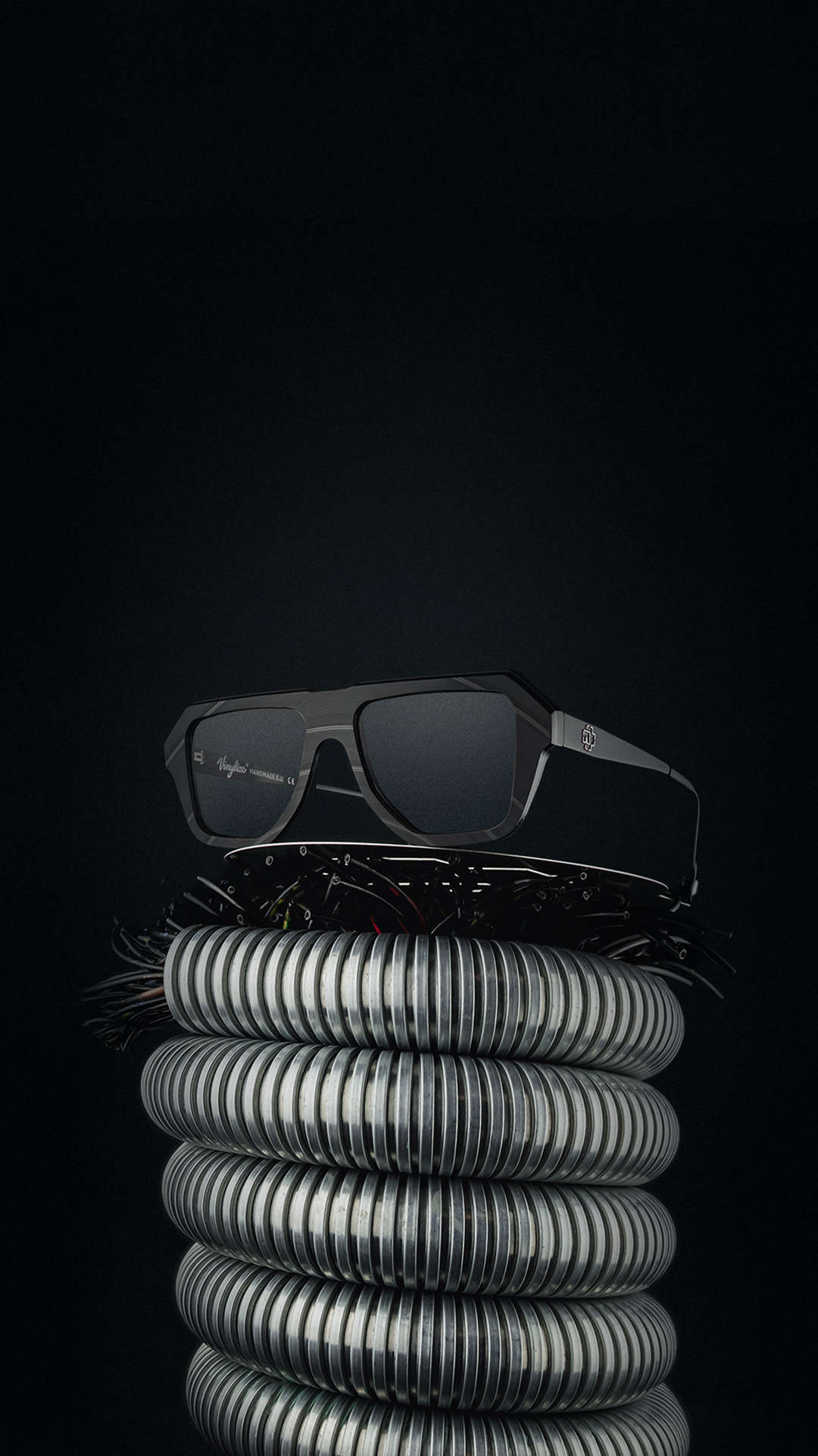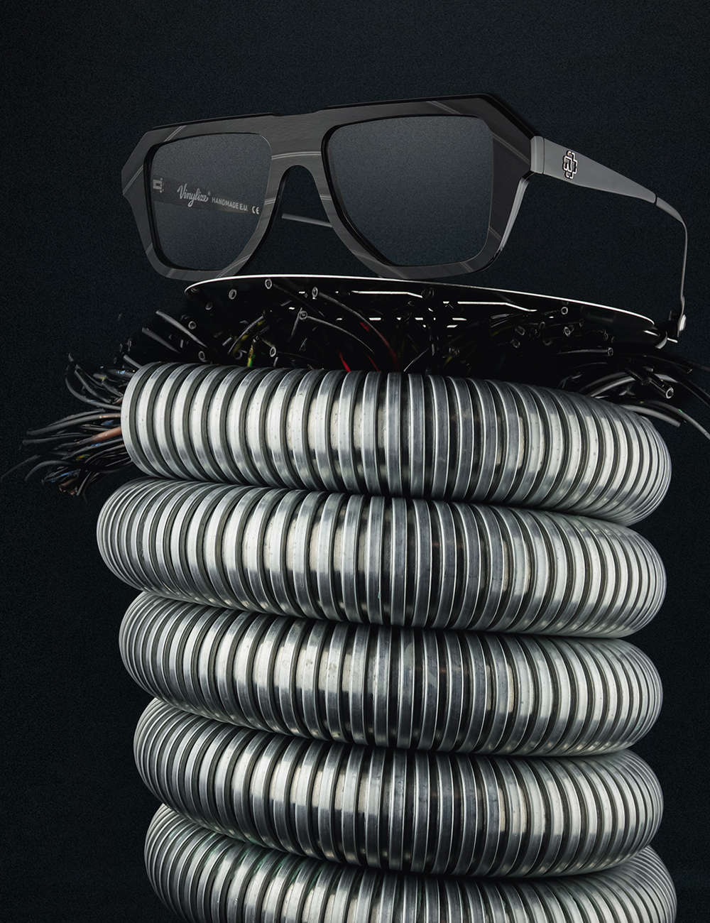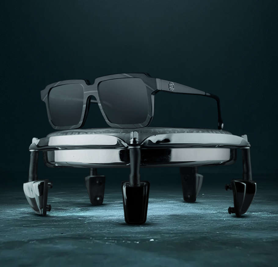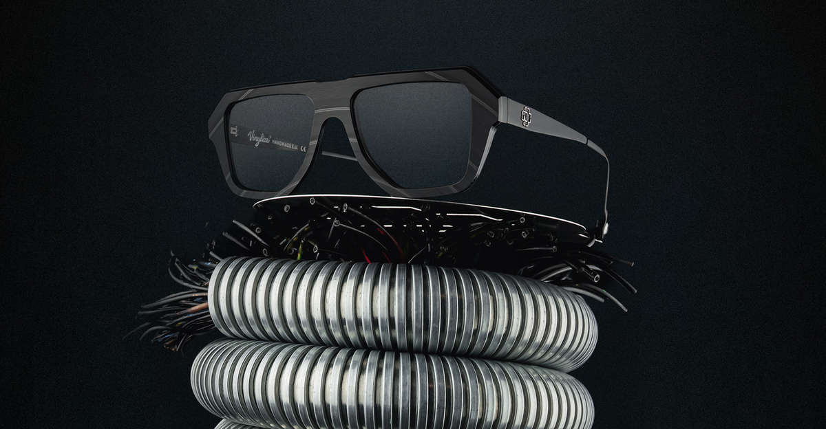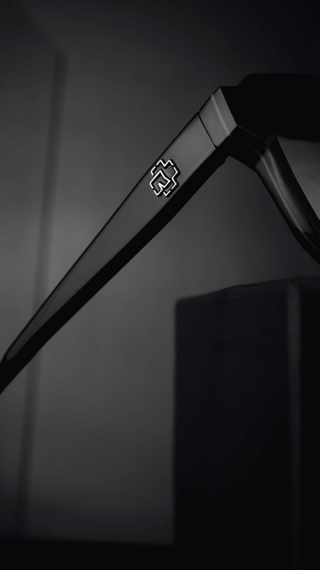 Each frame carries the “R” emblem like an industrial hallmark. Inside, logo, model number and serial identity sit like the typography on a machine plate. A distinctive element completes the design: a black, embedded volume-knob detail at the temple tip – a subtle echo of stage power, control and overwhelming presence.