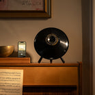 Handmade from four recycled 12" vinyl records, this 30W full range stereo bluetooth speaker brings energy into any space. Use either a single Sound Saucer or take two and enjoy stero. Connect either your mobile phone or plug your turntable in directly (may require a pre-amp).